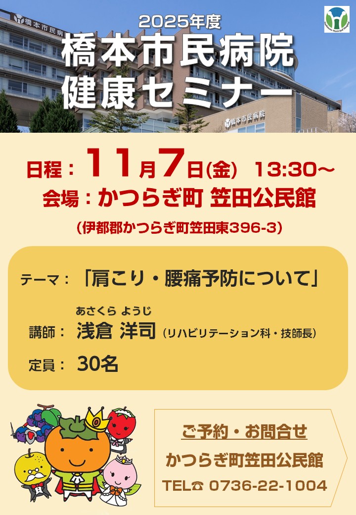 11月7日、かつらぎ町笠田公民館で健康セミナーを開催いたします。橋本市民病院ではたらくスタッフが、皆様の悩みや気になるギモンに寄り添います。ご予約は、下記の電話番号までお問い合わせください。